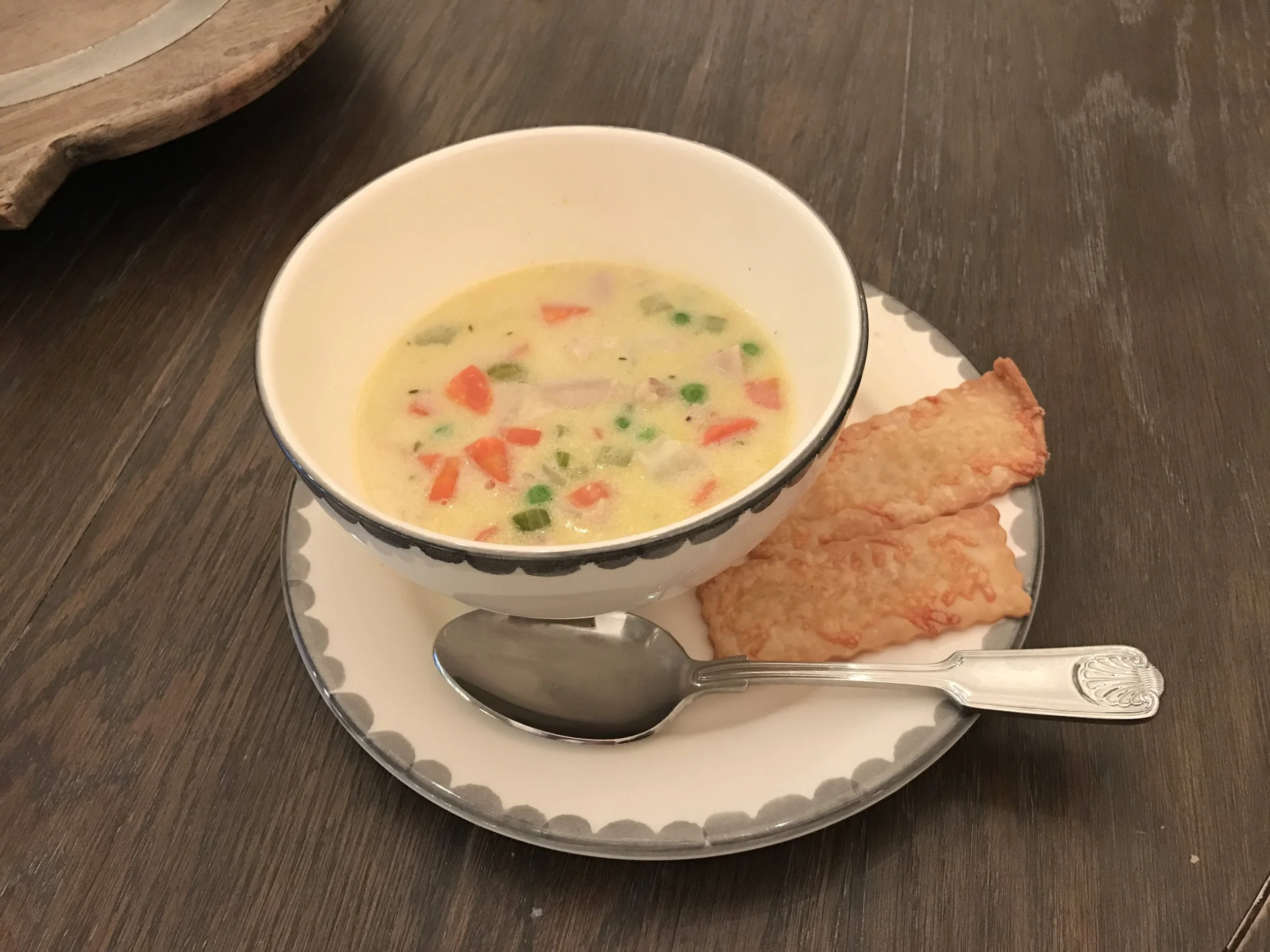 The pie crust dunks are a nice touch with this soup. Together, it makes for an easy, deconstructed version of the American classic Chicken Pot Pie.
