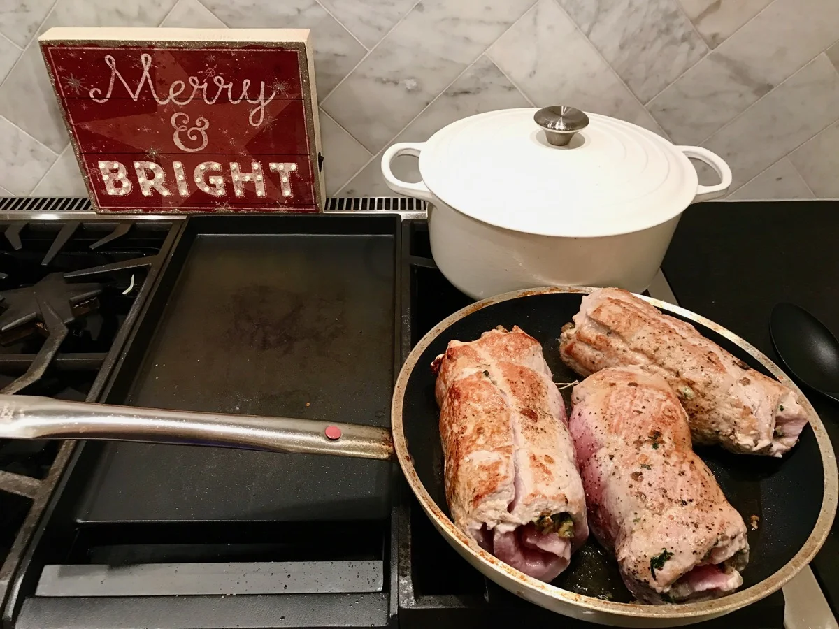 The main dish was the Holiday Stuffed Pork with an amazing filling that includes crumbled Italian sausage and sautéed spinach. It makes for delicious entree for this time of year. I served it with the Toasted Hazelnut Green Beans, Sweet Potato Gnocchi Gratin, and Crispy Potato Puffs. I poured a touch of pan gravy over the pork to savor the rich flavors from cooking.