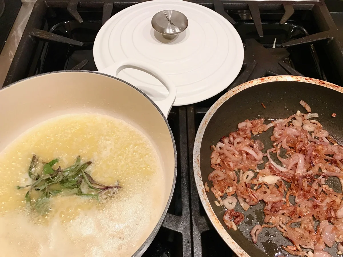 I planned a four course menu consisting of an Appetizer Selection, White Velvet Bisque, Holiday Stuffed Pork, Sweet Potato Gnocchi Gratin, Crispy Potato Puffs, Toasted Hazelnut Green Beans, and Crème Brûlée Cheesecake.
