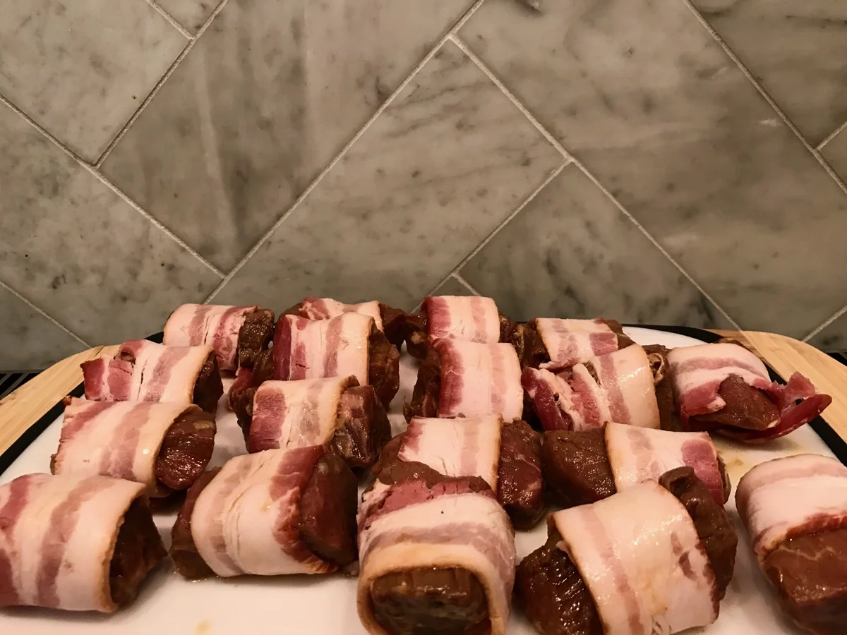 Now the fun part ... wrap the beef filet in bacon -- I said it! Schmear the bread with our buffalo spread, top with chicken, and get ready to bake. And, last but not least, fry those tots.