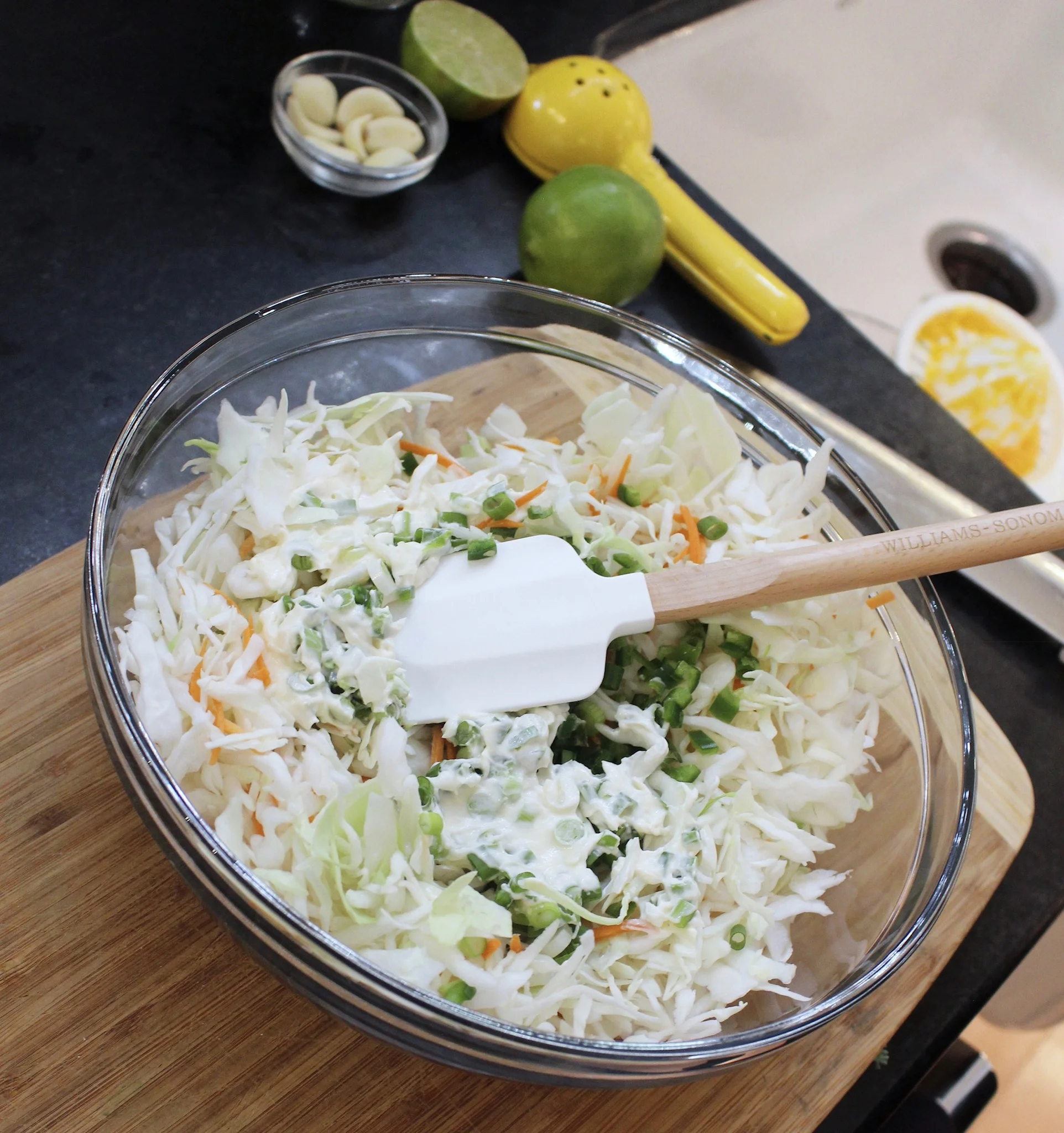 Toss the slaw, diced jalapenos, green onions and your favorite homemade slaw dressing. Chill until time to serve.