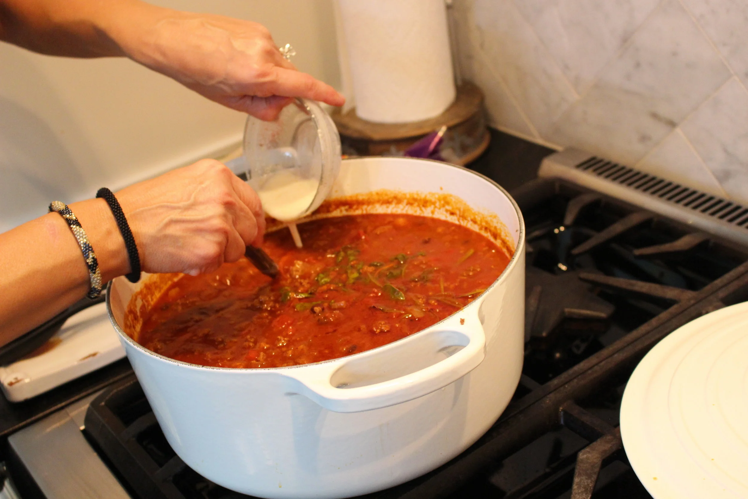 Chili simmering with fresh herbs line cilantro and a bay leaf
