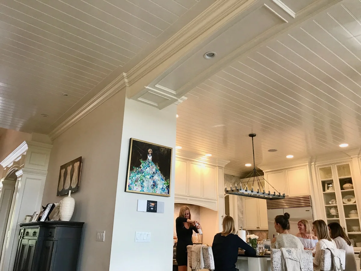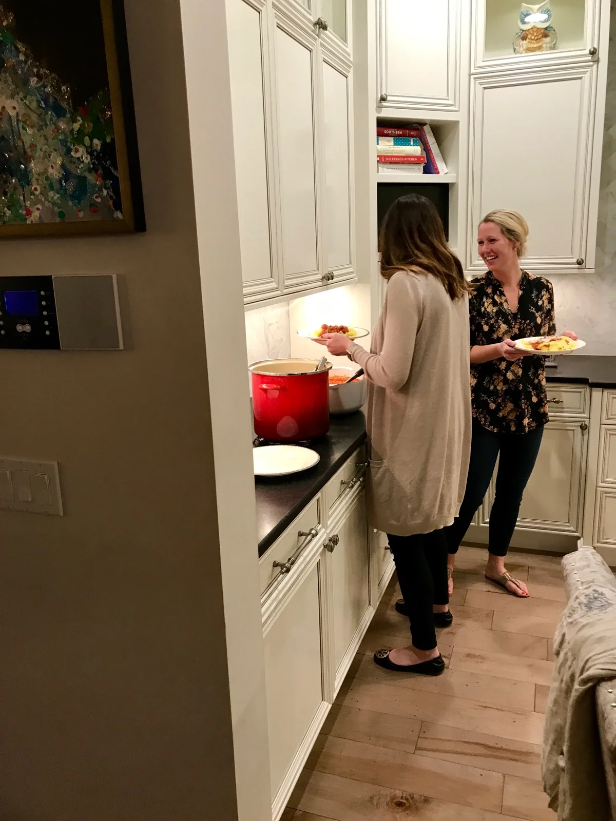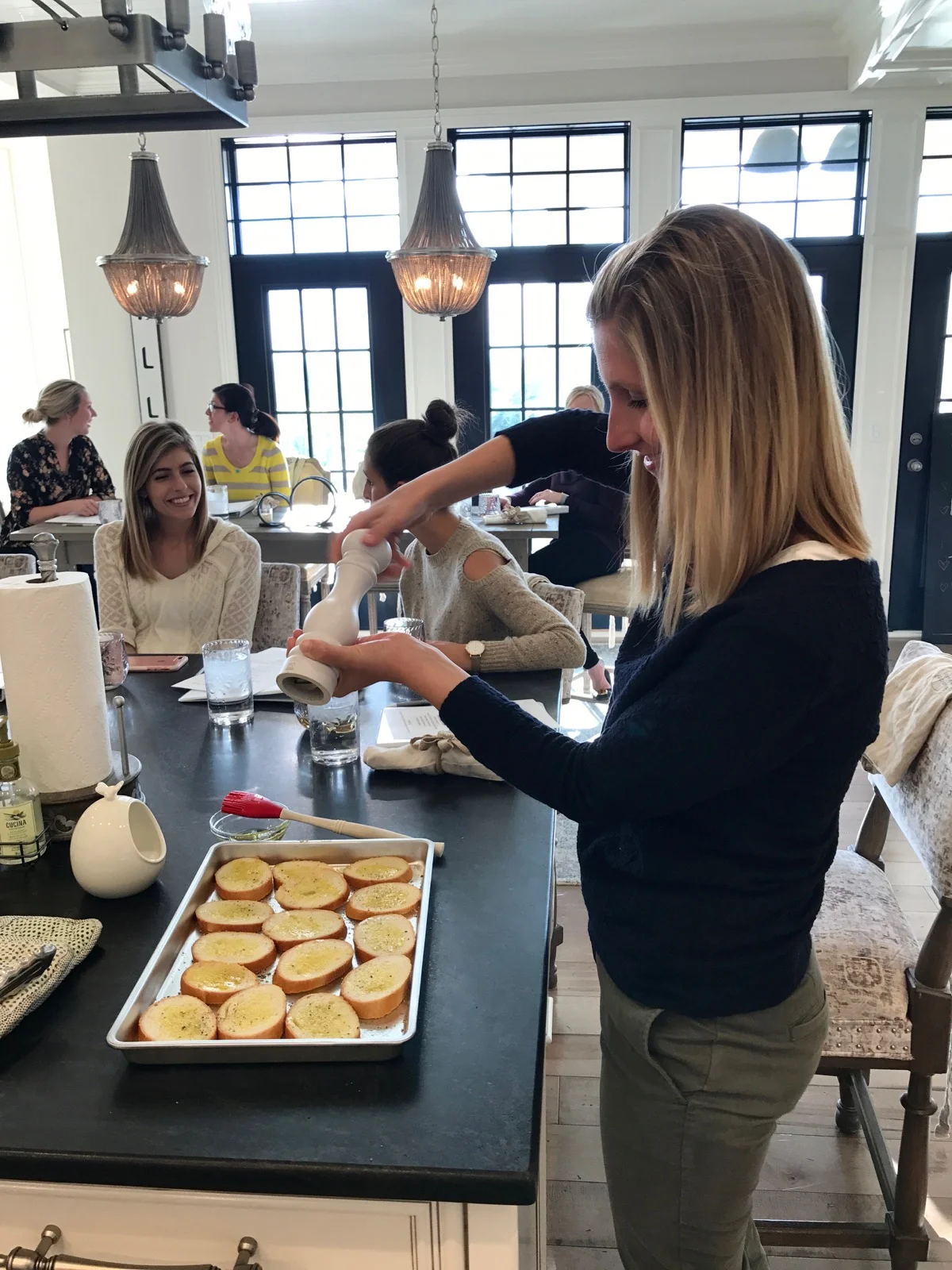 We broke open the wine and started on the Bruschetta Bar! You guys -- guess what I did! I burned the bread. (Surprise surprise!) Kitchen mistakes happen. Don't stress! Luckily, I know myself too well and planned for extra bread. Plus, it gave my students a chance to jump in and help. Thanks ladies!