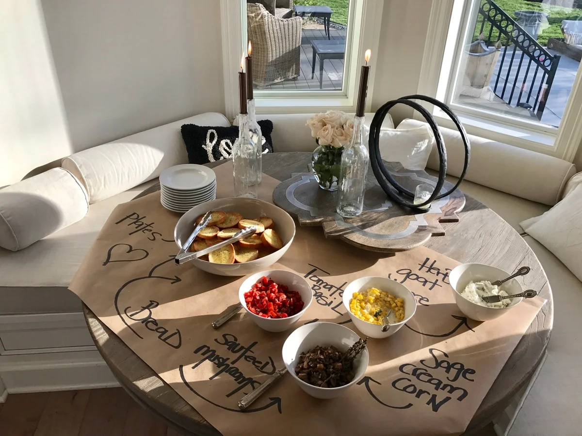 So happy to be back in the kitchen with my "Napa Love" menu: Bruschetta Bar with Traditional Tomato-Basil, Herbed Goat Cheese, Sautéed Mushrooms, & Sage Creamed Corn, Tuscan Pork Ragu, Chopped Kale Salad with Warm Pancetta Vinaigrette, and Chocolate Croissant Bread Pudding.