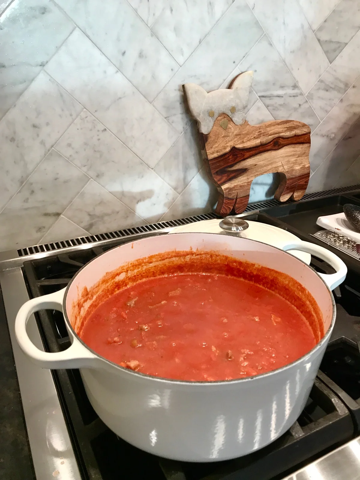 The Tuscan Pork Ragu is one of those recipes that needs to simmer for about two hours so we got right on it while noshing on our bruschetta. Made from fresh vegetables, tomatoes, chopped pork roast, and red wine... it's a true gem.