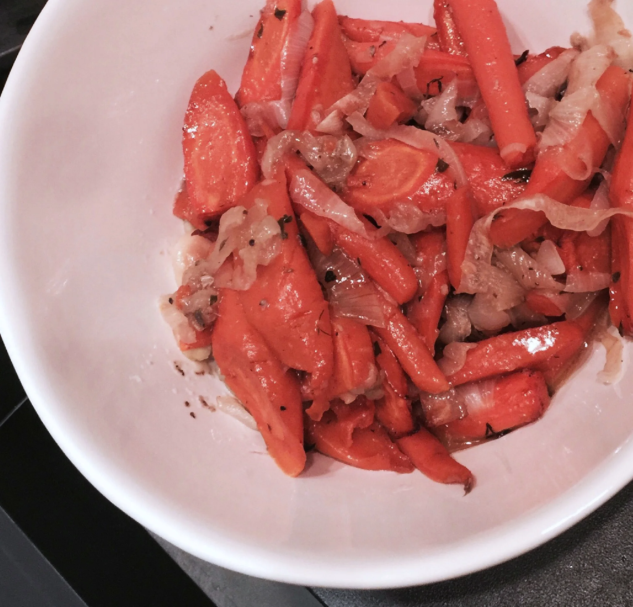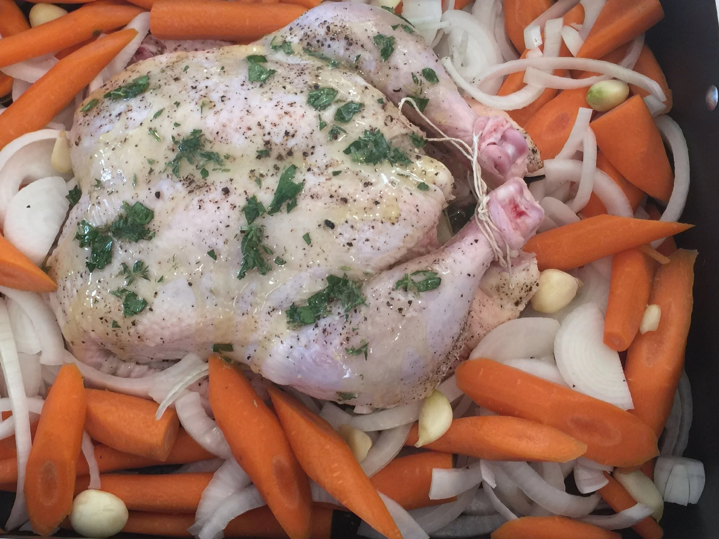 My herb roasted chicken has fresh cut herbs from my garden on the inside with some citrus and garlic-as well as on the outside too! Carrots and onions caramelize and take on all those roast chicken flavors