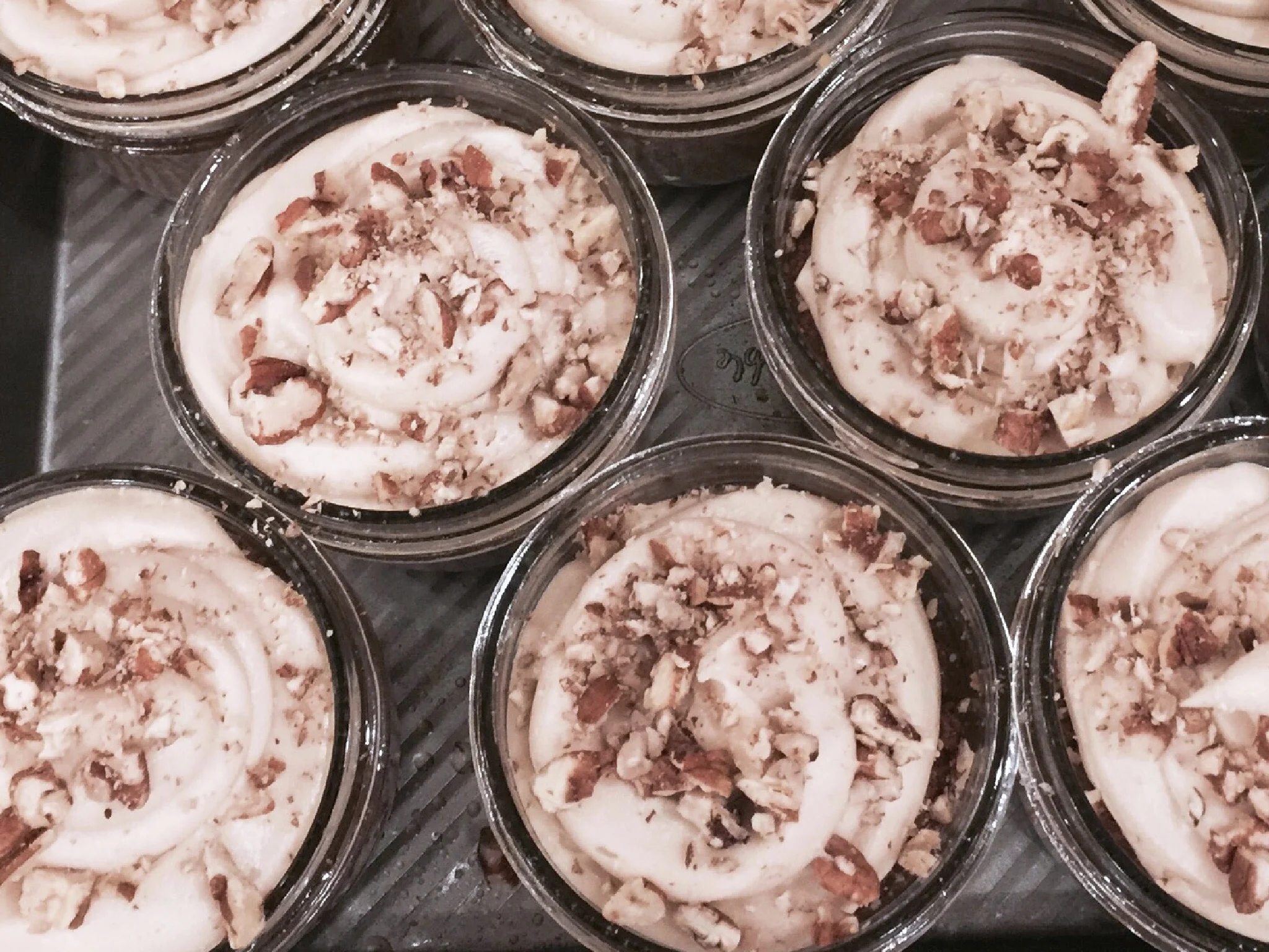 These super moist carrot cakes cool a bit out of the oven and then are topped with a swirl of decadent brown sugar cream cheese frosting. When the cakes are left a little warm the icing oozes right into the moist cake and it just melts in your mouth. Every. Single. Bite.