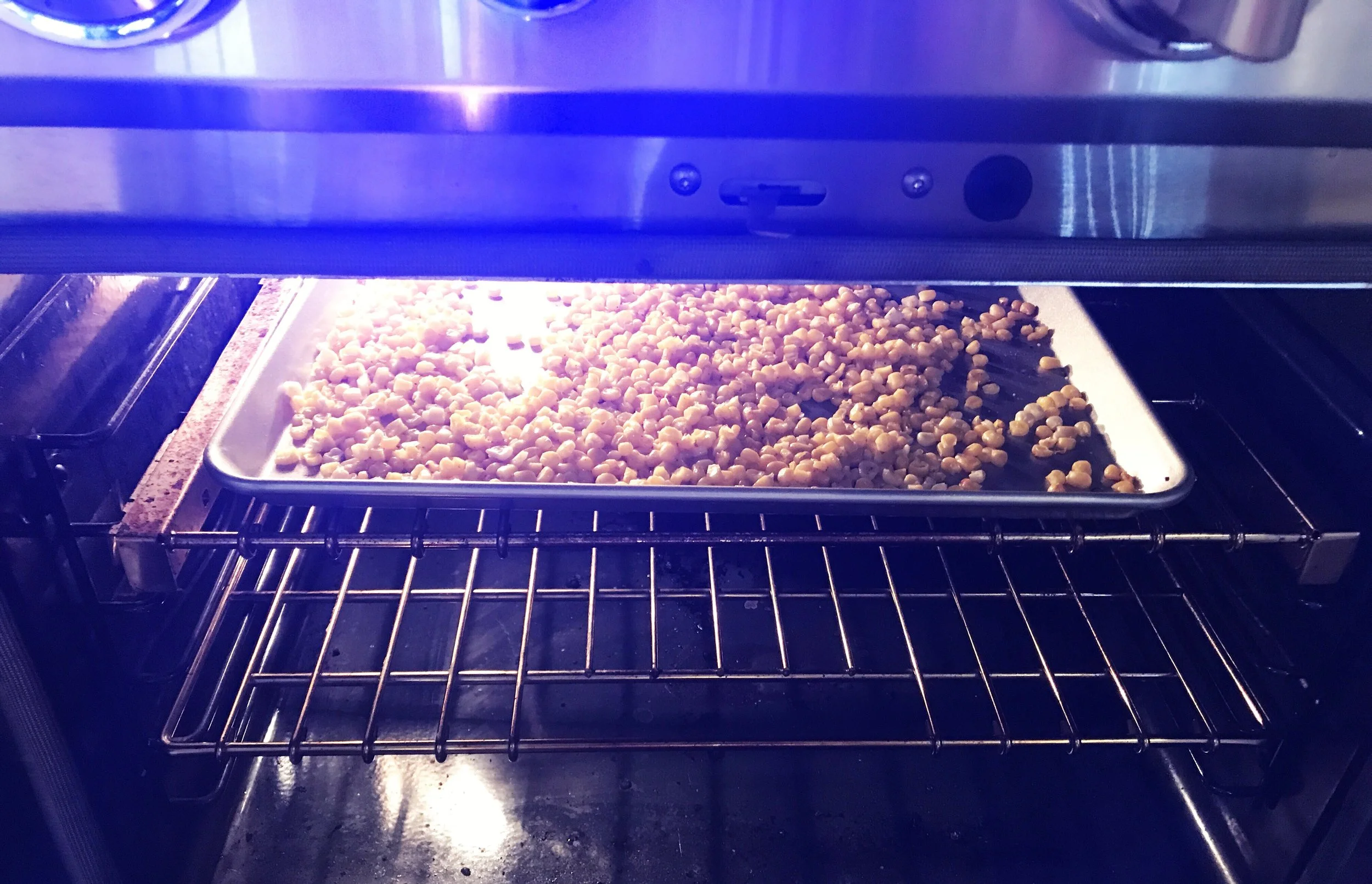 We threw corn in the oven and grill peppers and onion to create the amazing charred corn to top our shrimp tacos.
