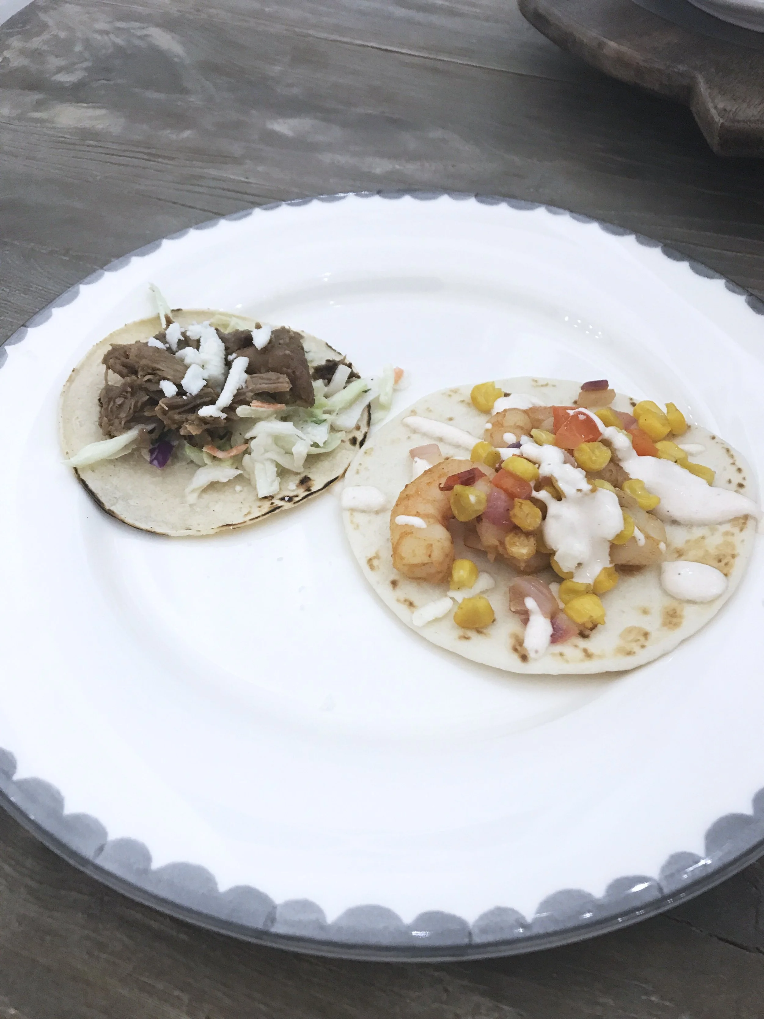 The carnitas pork is placed on the corn tortilla & topped with the colorful jalapeño slaw while the shrimp is placed on a flour tortilla topped with the charred corn creating a plate that truly tells the "tale of two tacos".