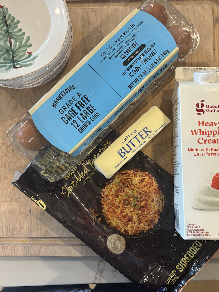 In a mixing bowl, combine Heavy Whipping Cream, Eggs, Salt, Pepper, and Nutmeg. Whisk together!