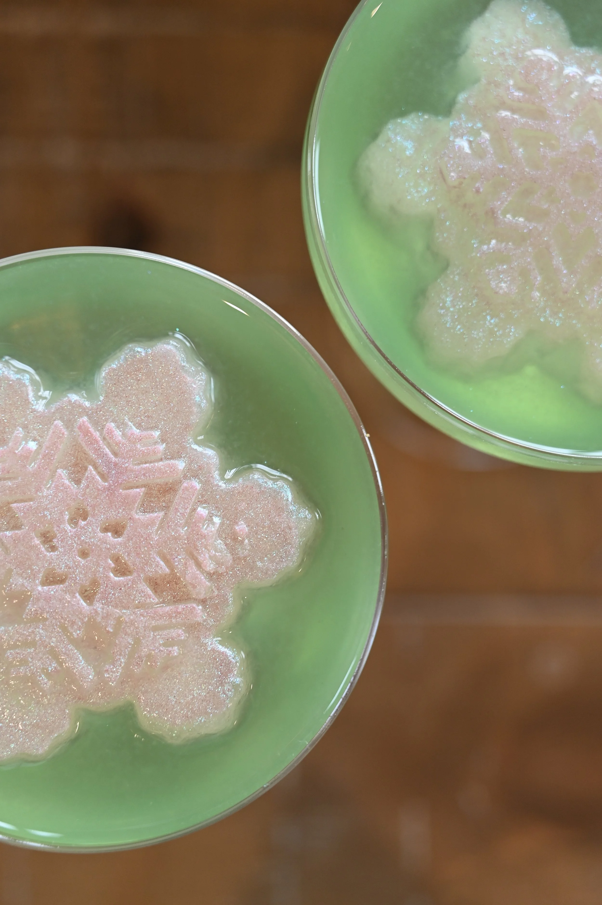 Pour the White Cranberry Juice into the snowflake molds and tap in some Edible Glitter.
