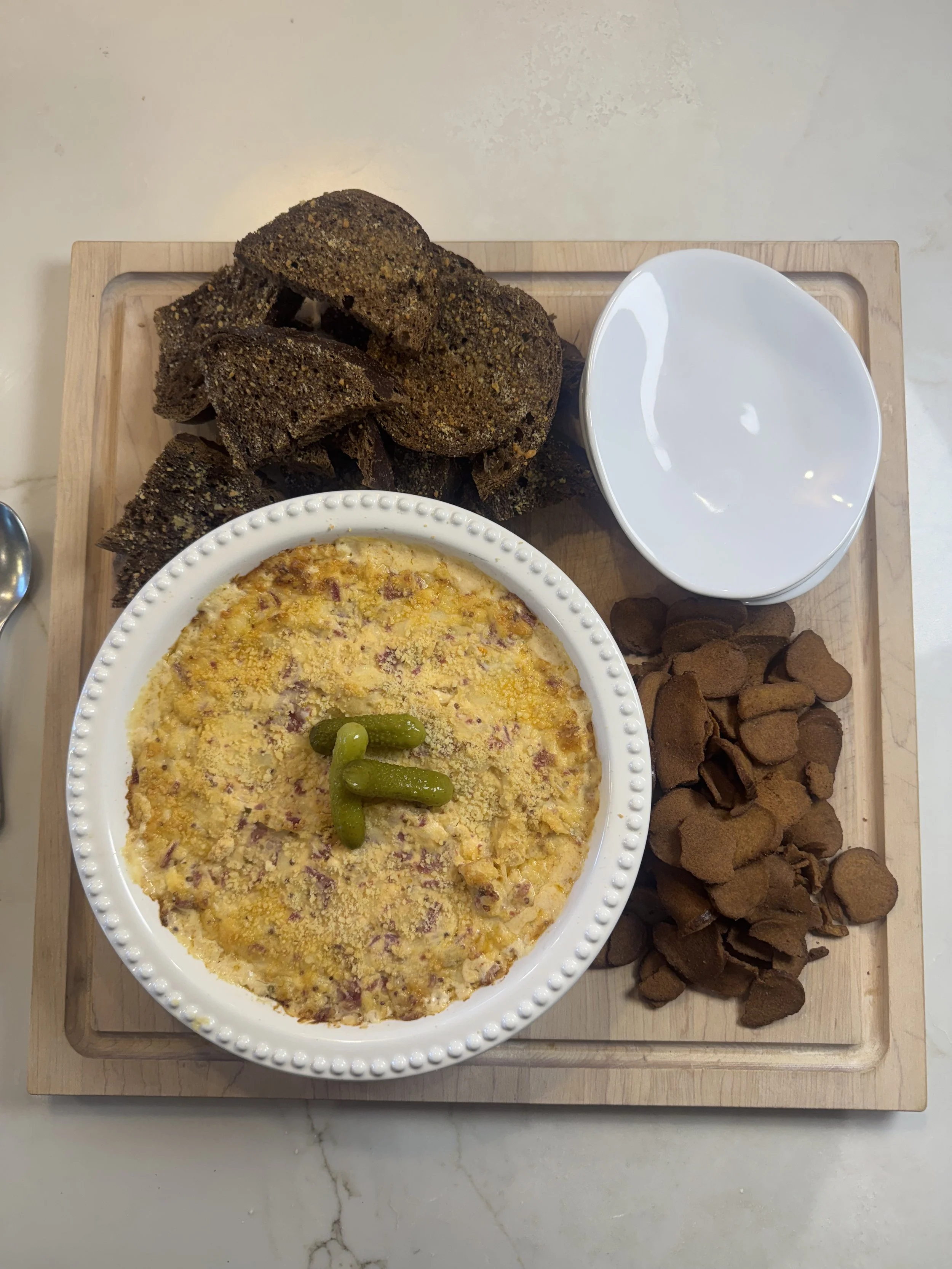 In a bowl, add Cream Cheese, Thousand Island, Mayonnaise, Mustard, Saur Kraut, Corned Beef, and Swiss Cheese. Combine well using a hand mixer. Put in a baking dish. Dust Parmesan on top. Bake at 350 degrees for 20 - 25 minutes. Enjoy!